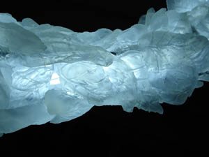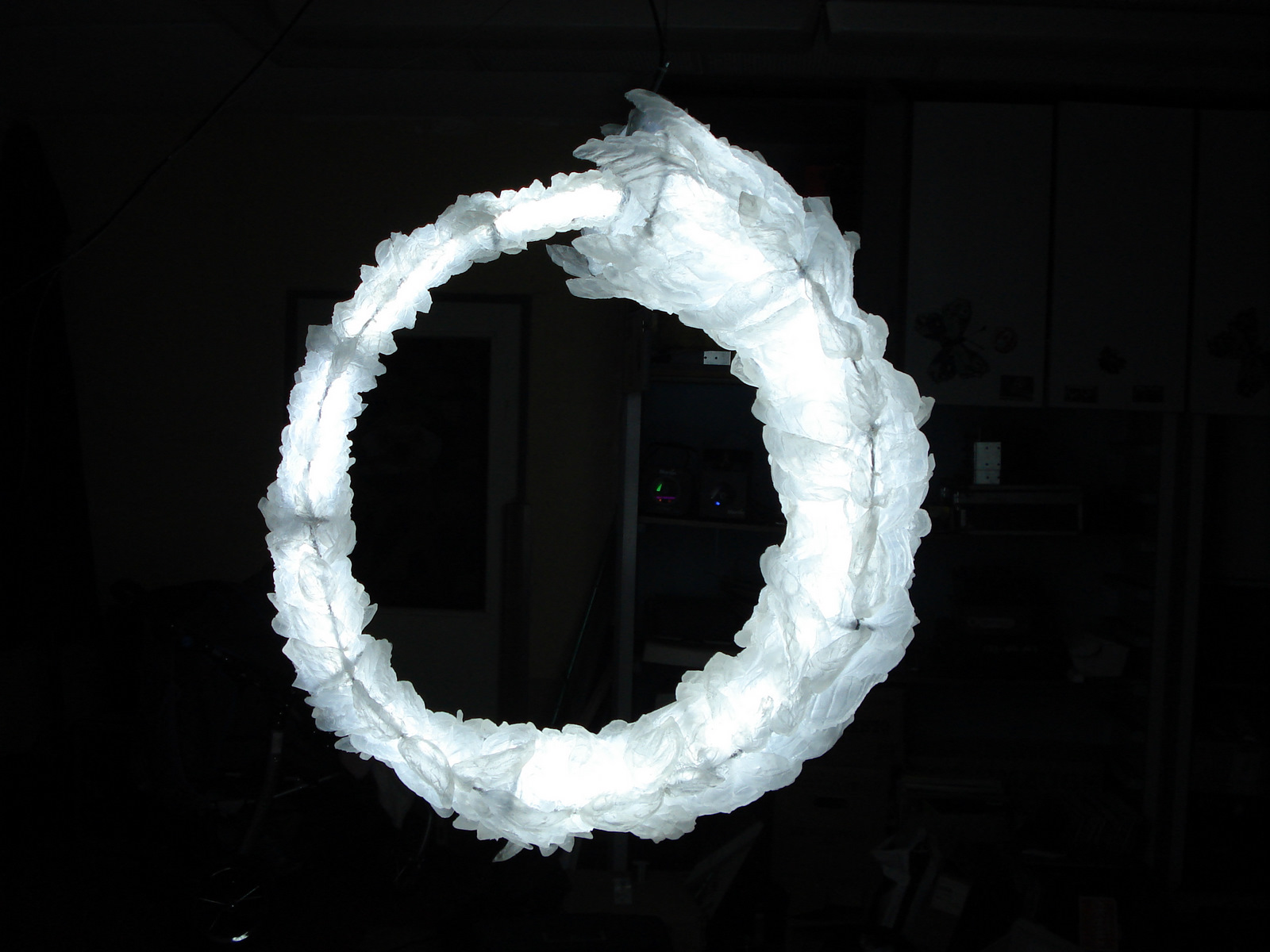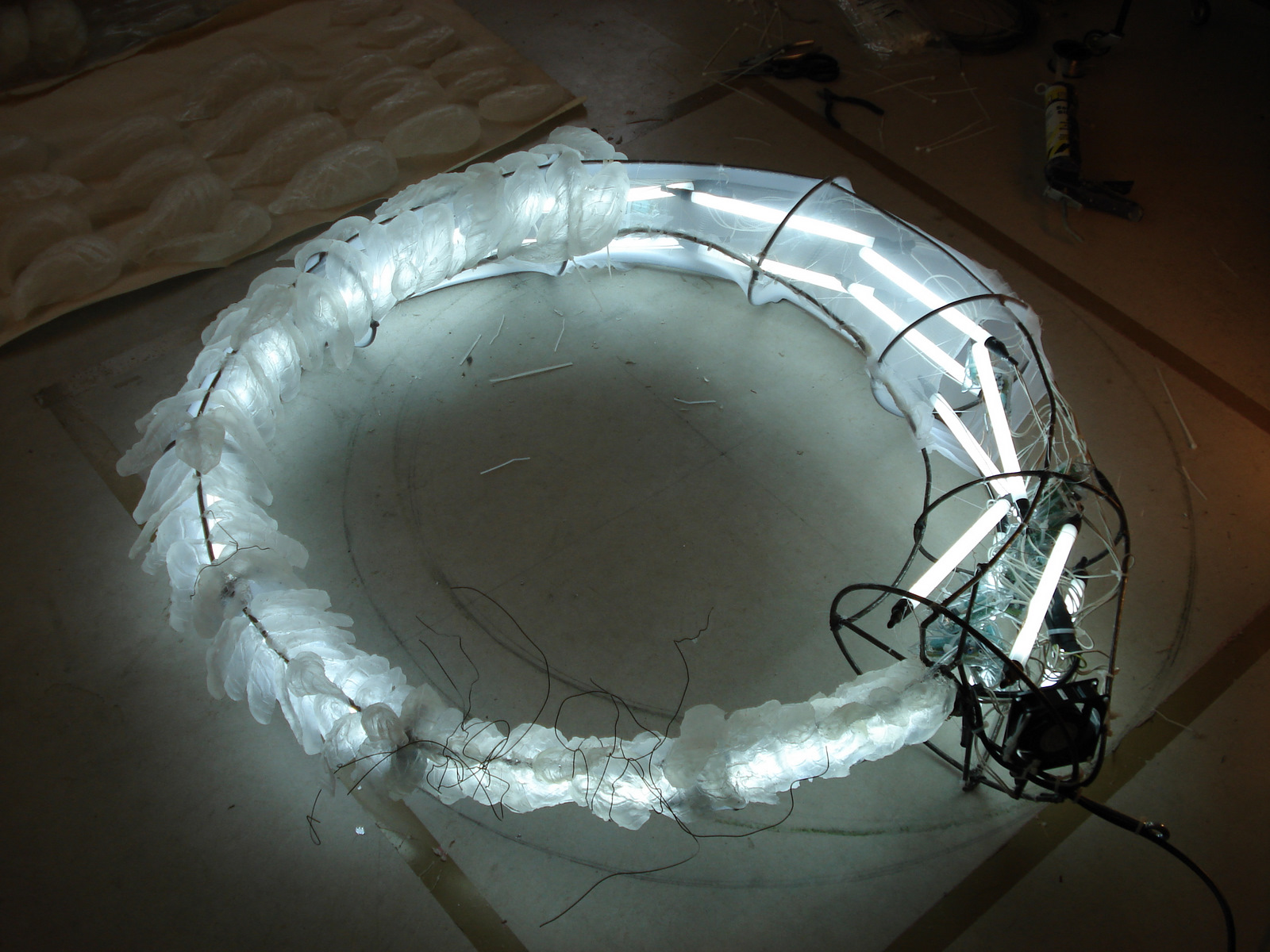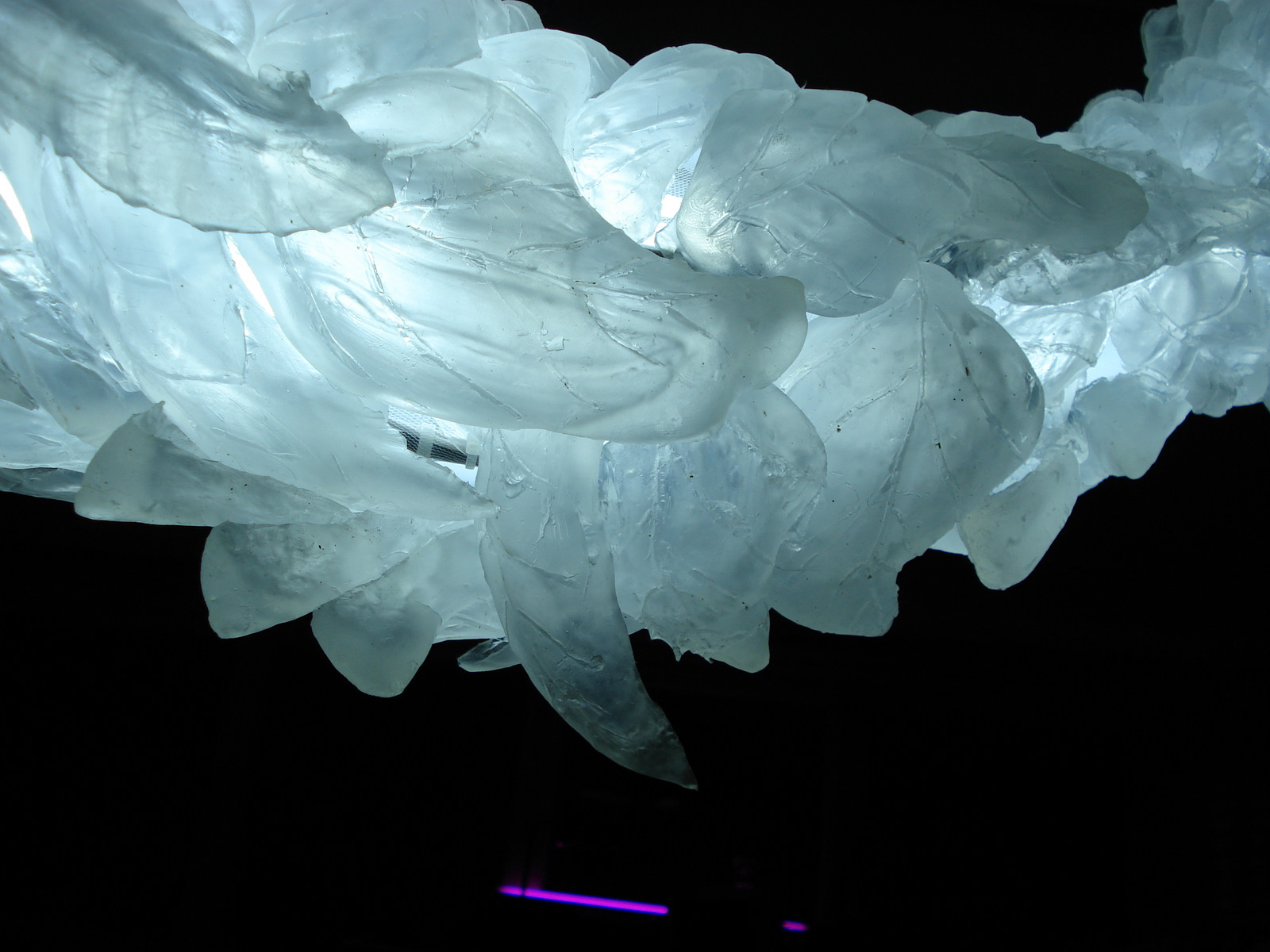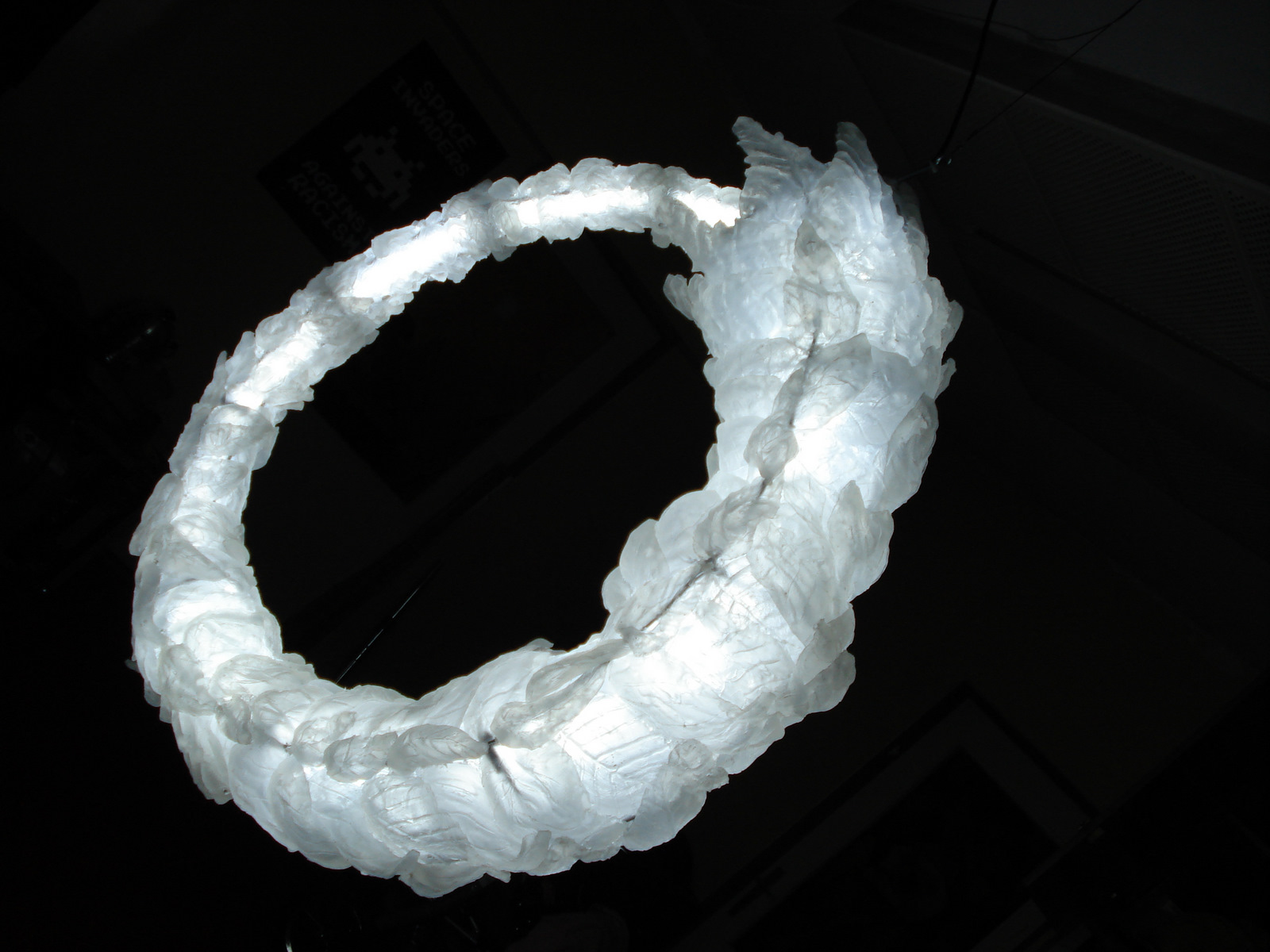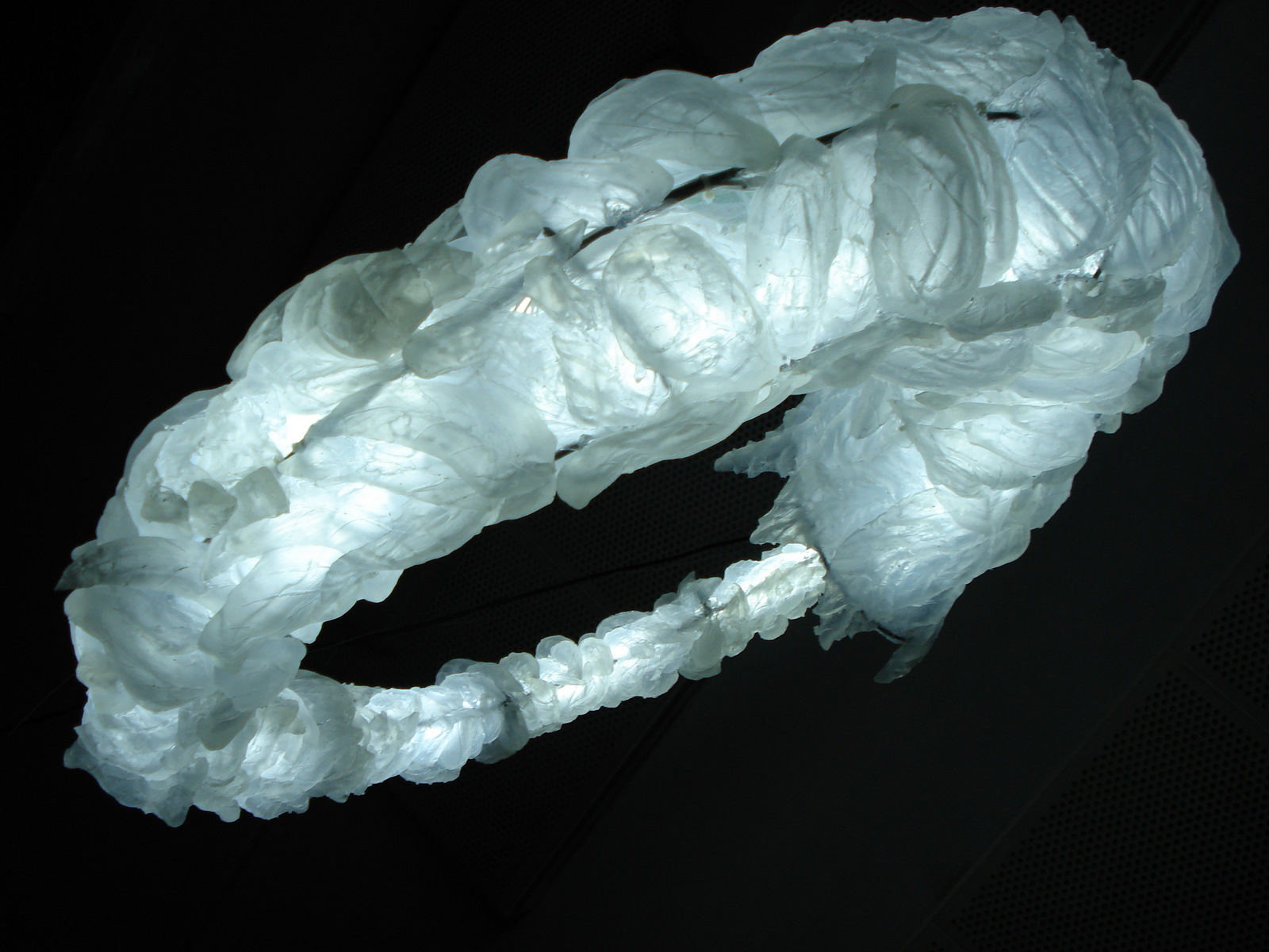 Light installation of transparent leaves made out of silicone, being duplicated endlessly , from the tiniest new born to the most adult bright leave. Seeing time in a cyclic form, other than linear. The direction of growth is similar to both sides. In the sculpture, time is symetrically inverssed. The symbole of Ouroboros, the snake or dragon devouring its own tail, is the alchemical symbole of eternal recurrence. Its representing self reflexivity or cyclicality. In the sense of something constanly recreating itself, the eternal return, and other things perceived and cycles thet begin a new as soon as they end. The light within related to something excisting before any beginning with such forel and qualities it can not be extinguished.