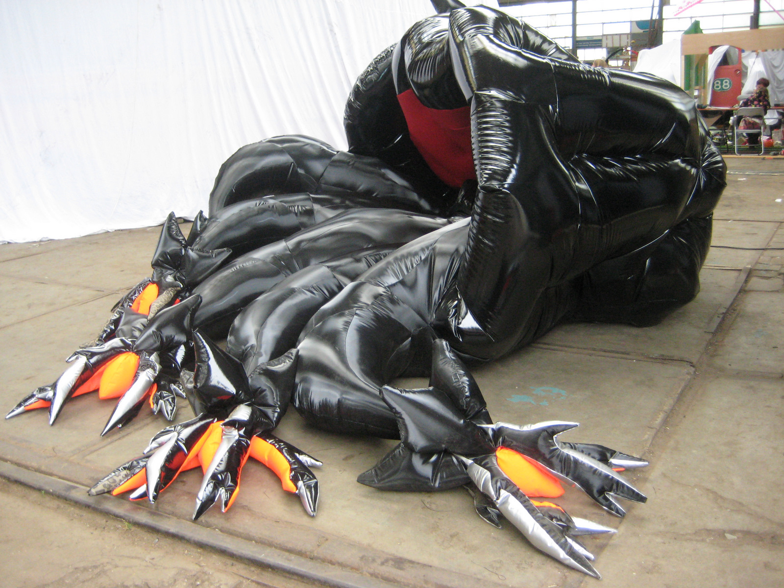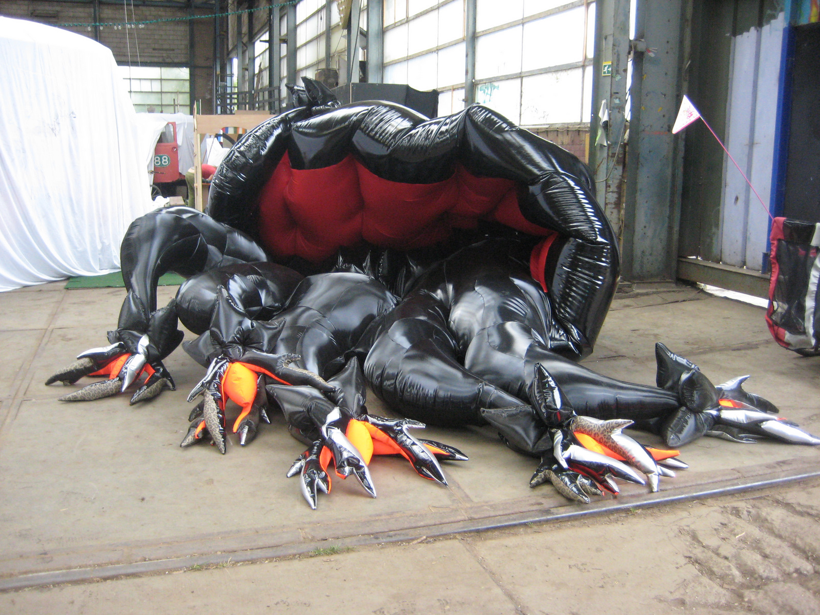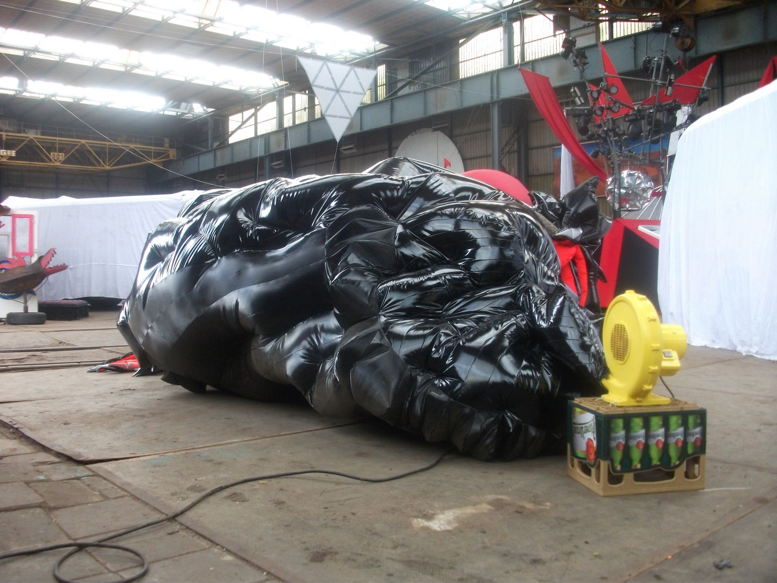An inflatable space, a muschel shape, a cave built out of six black arms moving in spiral. each the inflatable is a flexible prolong of the bodey, a breathing armour, a living organism